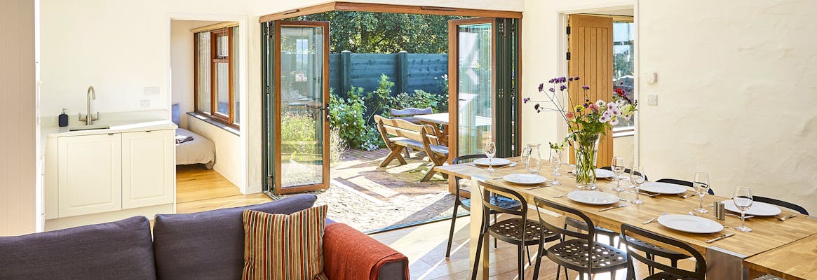 The Cows Barn contains a spacious open plan living, dining and kitchen area which overlooks the court yard, offering stunning views of the Quantocks highest hill - Wills Neck.